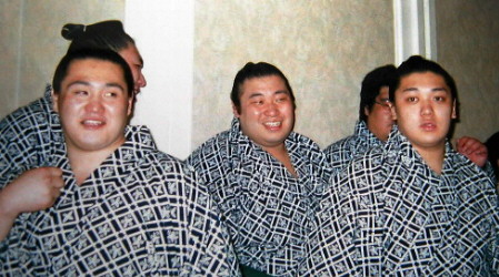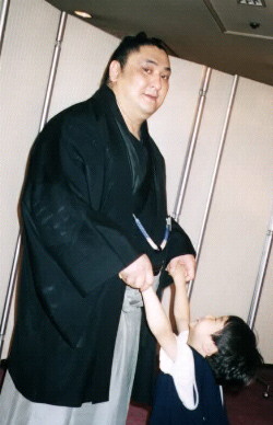 会場の後の方で,息子さんと遊ぶ北勝鬨関を発見.この表情は,勝負師というよりも,双子の兄弟のお父さんといった感じでしょうか.