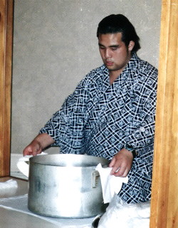 パーティ開場の隅の方では,伊勢ノ海部屋のチャンコが振る舞われます.右が九州場所で入門した徳海山さん.番付に名前が載ってから2場所連続して勝ち越しています.